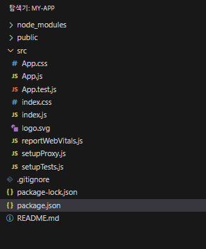 - 위처럼 React 프로젝트가 가진 파일들이 보일 것입니다.