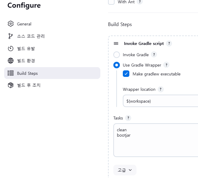 - 레파지토리에 gradlew가 있다면 ${workspace}를 입력하면 되고, 레파지토리 내 다른 gradlew가 있다면 ${workspace}/프로젝트명을 입력하면 됩니다.