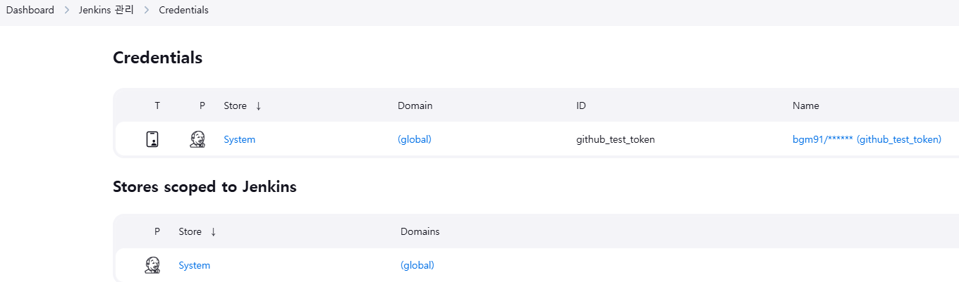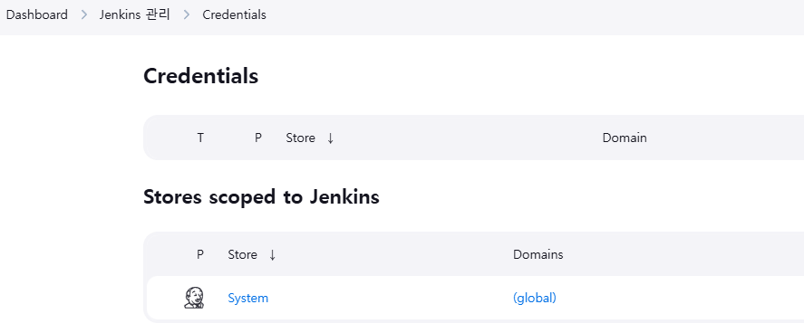 - 좌측 메뉴탭에서 Jenkins 관리 > Credentials 클릭