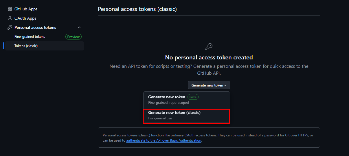 - Settings > Developer Settings > Personal access tokens > Tokens(classic) 화면의 Generate new token을 클릭하여 Generate new token(classic)을 눌러줍니다.
